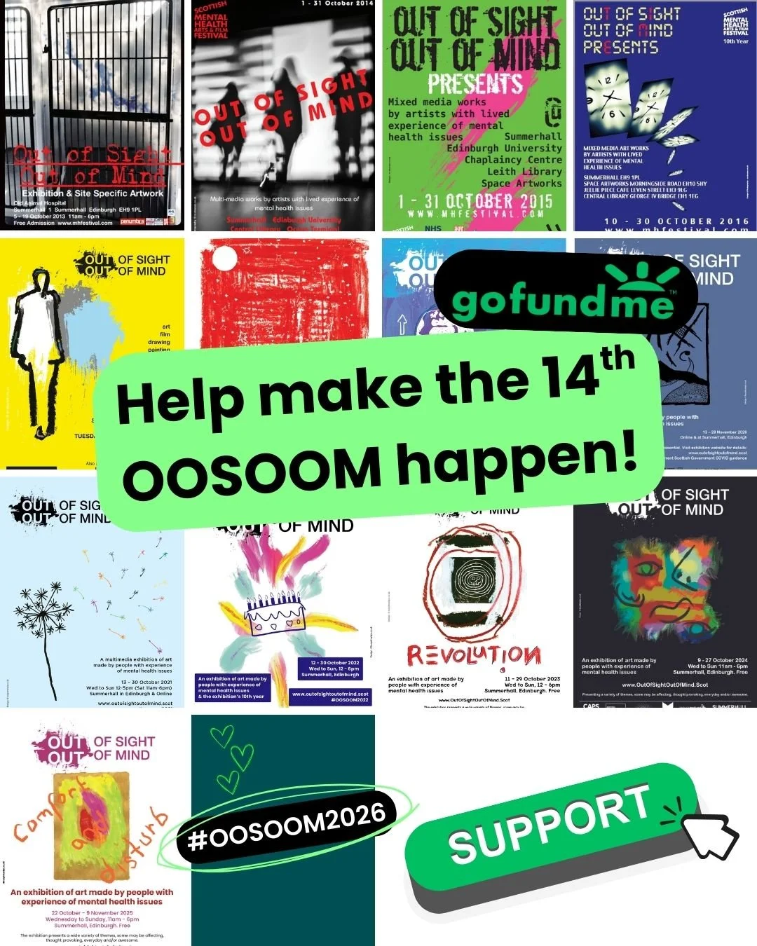 ID: Image presenting a grid of 13 annual Out of Out of Sight Out of Mind posters. Text in centre reads ‘Help make the 14th OOSOOM happen’. Other text says ‘Go Fund Me’, ‘Support’ and ‘#00S00M2026’.