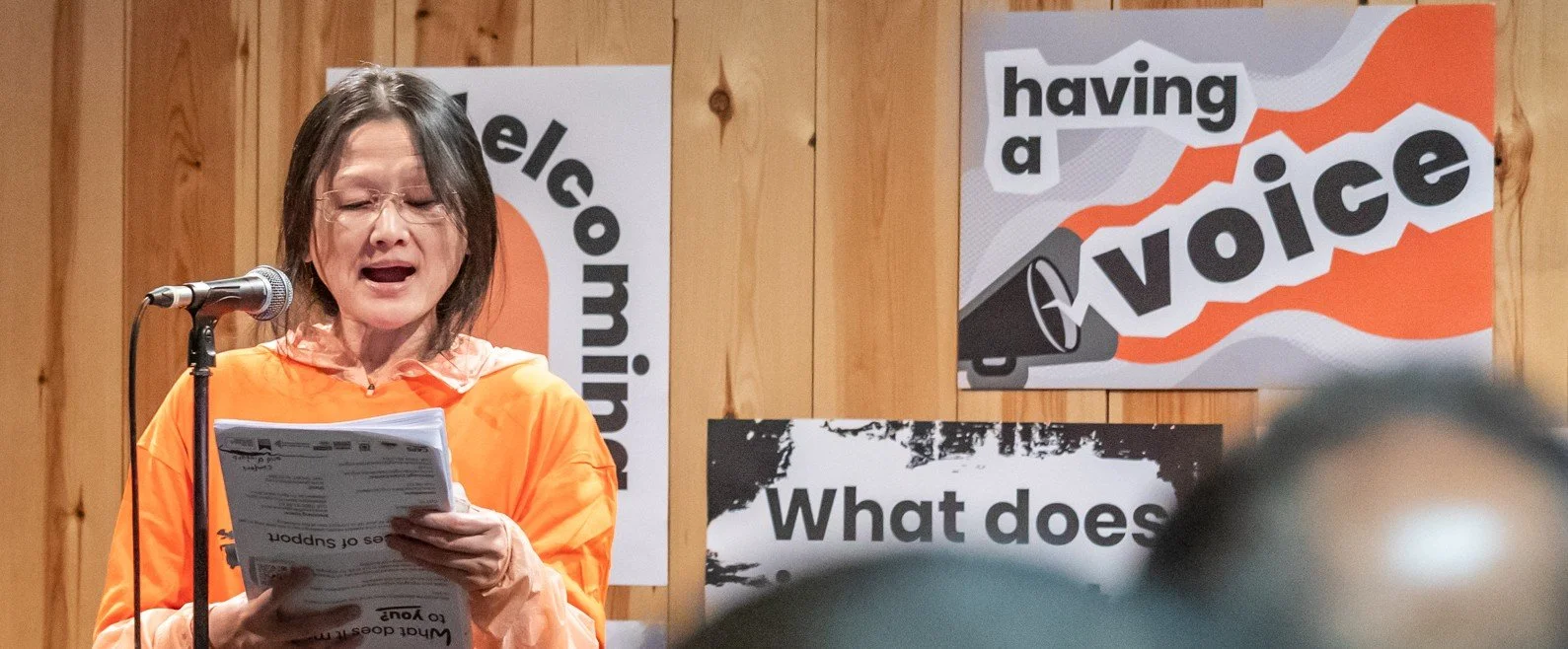 ID: A woman with long hair, stands at a microphone, reading from papers she holds. A poster in the background reads ‘Having a voice’.