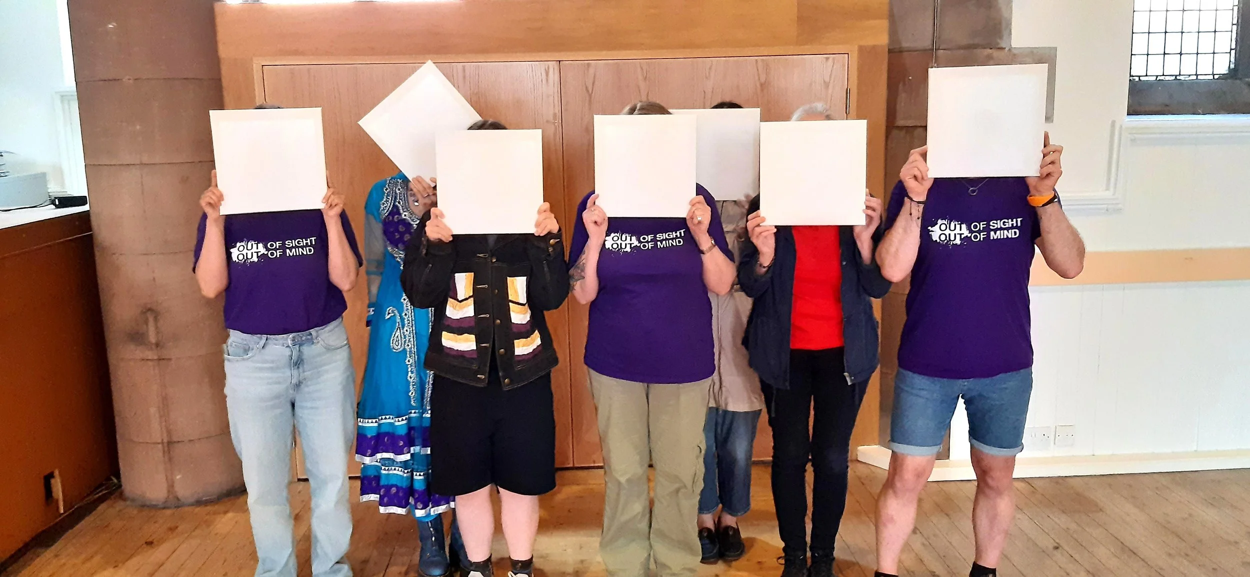 ID: Seven people standing in a line, holding a 30cm x 30cm white blank canvas in front of their faces.