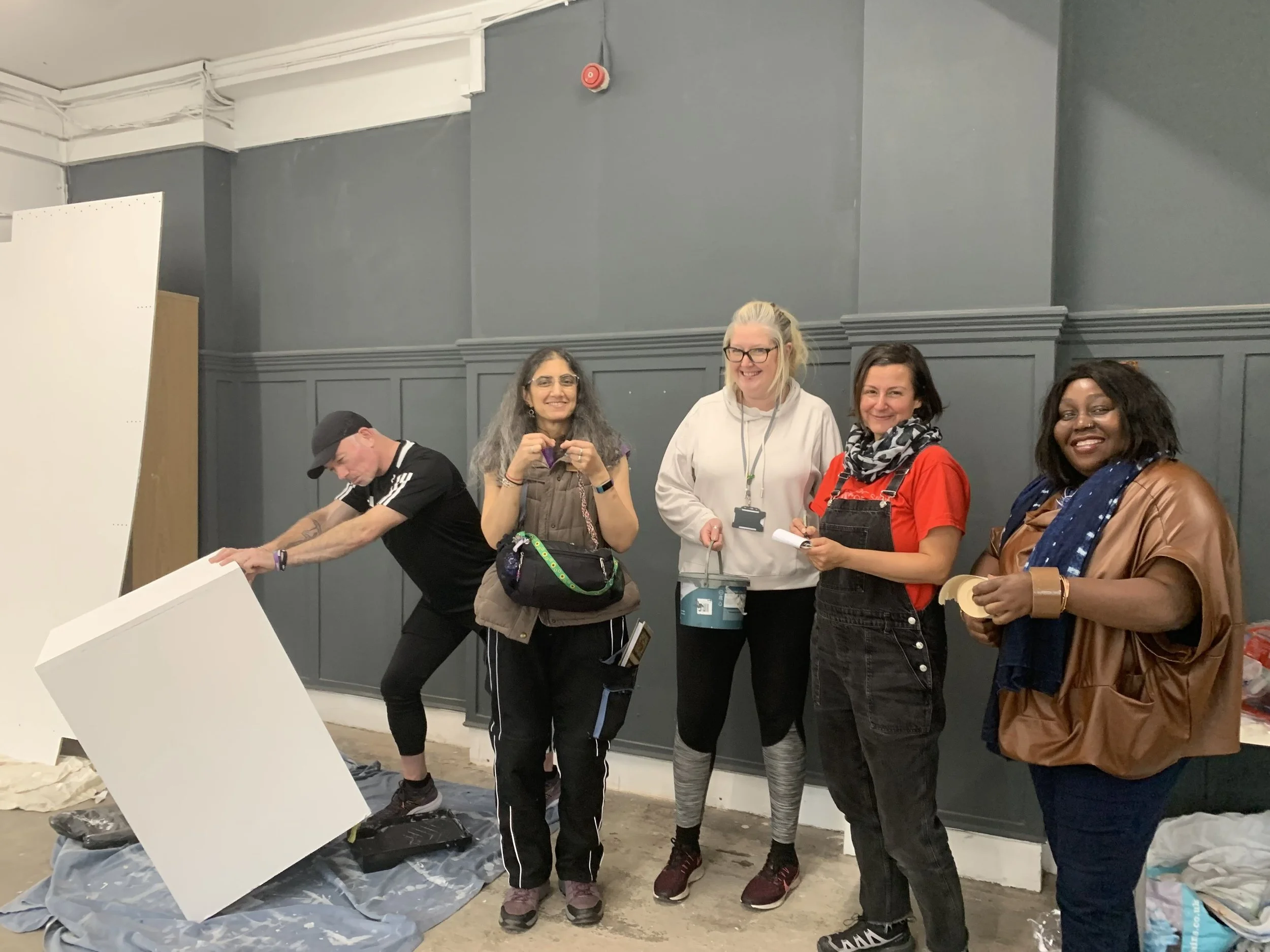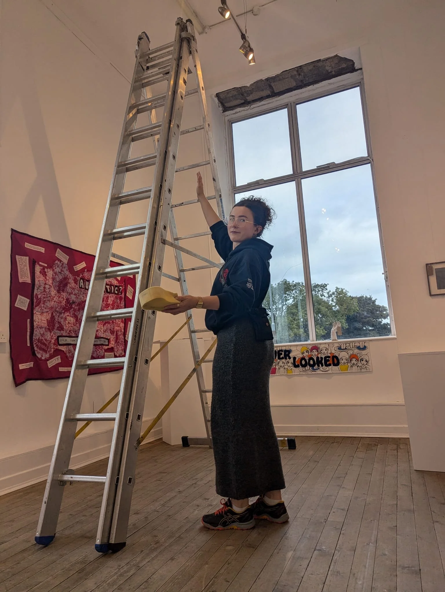 As we start to get close to the day of the Exhibition Launch it is time to crack open the white and grey paint and get touching up the paint work, mopping the floors and sweeping up the sawdust! A seemingly unglamorous series of jobs, it’s made all the more glamorous when dressed in such fetching painting onesies! It is equally fun nevertheless and an important part of the process to make sure we show each artwork as best as we can.